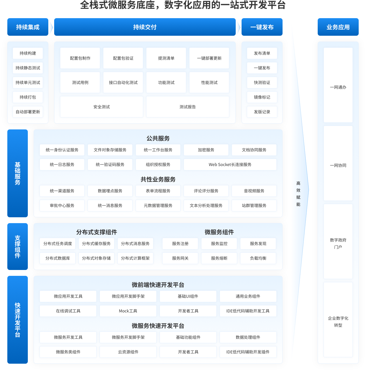 数字化支撑底座平台是为数字政府与企业数字化转型构建的统一技术赋能平台。平台基于云原生与微服务架构设计,深度整合服务治理、共享能力中心、快速开发工具、分布式支撑与智能运维等核心模块,提供从开发、集成、部署到运维的全栈技术能力。通过标准化、平台化与数据化的方式,平台显著降低系统复杂度与技术门槛,助力实现服务的敏捷开发、高效协同与稳定运行,为业务智能化的未来演进奠定坚实基石。