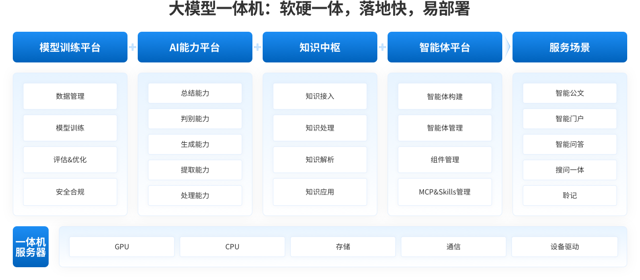 大模型一体机,集训练推理、数据管理、安全管控于一体,支持私有化数据训练和弹性算力扩展,专为行业模型快速构建、部署而打造。其搭载训推一体化软件引擎,实现训练与推理无缝切换,省去硬件环境搭建、系统适配及计算存储资源配置等部署环节,大幅缩短落地周期,零成本推动行业模型快速落地。同时支持 DeepSeek 等主流大模型高性能、高精度部署,兼具极致性价比;内置一站式 AI 生产力工具及近百种智能体应用集,为“政、教、企”客户提供强大、易用且安全的AI生产力工具,加速数智化转型进程。