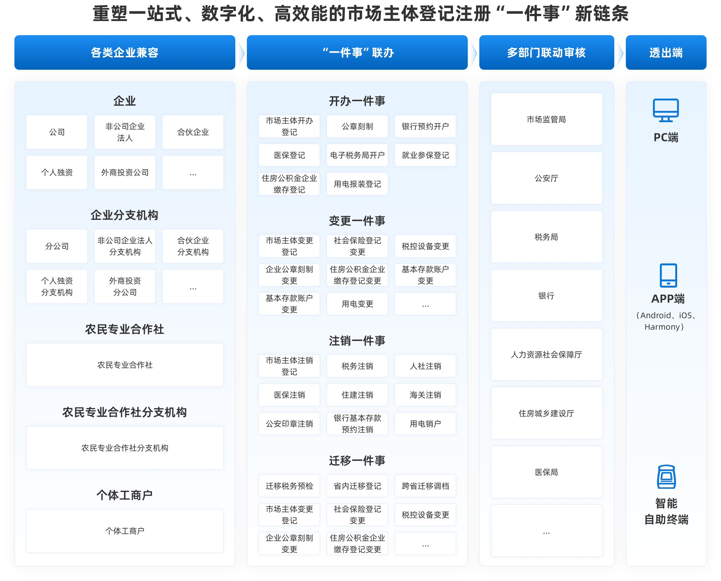 市场主体注册登记一件事解决方案,针对市场主体在办理注册登记业务过程总遇到的效率低、往返跑、材料复杂、数据壁垒高、“一件事”形式大于内容等痛点。该方案全面涵盖PC端、移动端、一体机等多元化渠道,充分横向拉通业务部门,完整调研各项业务办理前置和采集事项,真正意义上实现一表填报,跑一次等要求。本方案适用于开办、变更、迁移、数据填报、注销等多种应用场景。