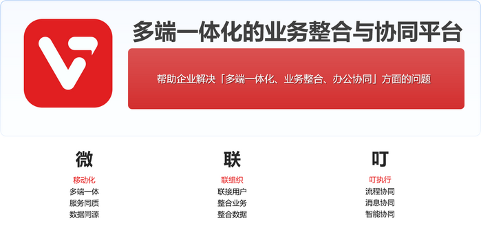 针对上述痛点,大汉软件推出“微联叮”多端一体化业务整合与协同平台,以“联组织、叮执行”为核心理念,构建覆盖企业全场景的一体化协同解决方案。