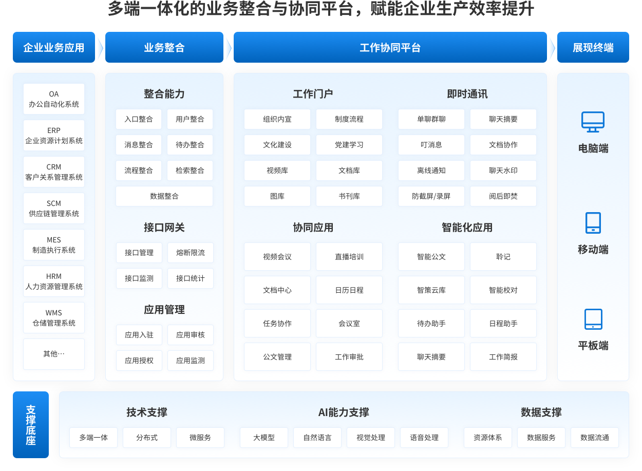 企业办公整合协同解决方案重点围绕企业内部服务入口分散、用户体系不统一、流程不互通、消息传递不通畅、内容搜索难、业务创新响应慢等问题,通过构建多端一体化的业务整合与协同平台——“微联叮”,实现企业内部各类业务、各个系统、各种数据的高效整合以及企业内外部、上下游组织体系和成员之间的高效协同。以移动化为服务渠道的延伸,提升企业办公便捷度与体验度;以数字化底座为支撑,整合企业各类系统,打通业务壁垒,实现高效互联;以大模型和智能化技术为驱动,加速内部事务处理效率,全面革新企业协同模式。
