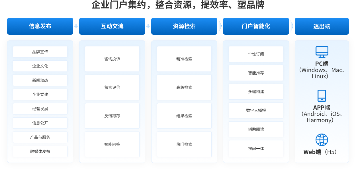 企业集约化门户网站群解决方案,针对企业内部普遍存在的门户建设分散、数据不通、使用不便等突出问题,立足顶层设计视角,按照统一标准体系、统一技术平台、统一安全防护、统一运维监管设计思路,对企业门户网站进行统筹规划,建设互联融通的企业网站集约化平台,有效整合企业各部分信息资源,打通信息壁垒、推进集约共享,助力企业节省建设成本、提升运营效率;通过整合融媒体发布渠道,聚合企业内外部资源,统一管理外宣内容,形成覆盖企业各级宣传部门的一体化融媒体传播矩阵,持续提升企业传播力、引导力、影响力和公信力。