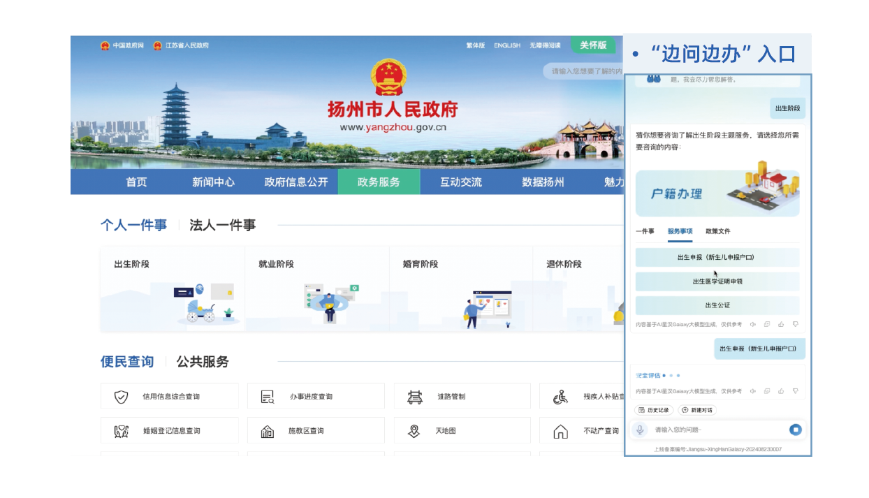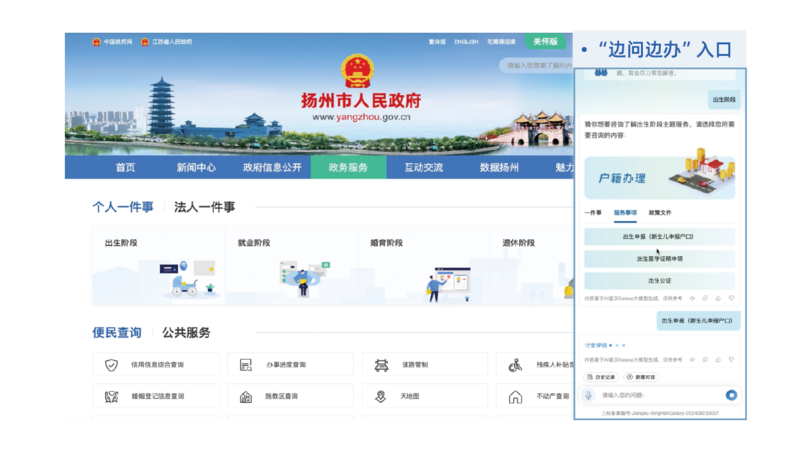 近日,在2025年数字政府服务能力评估暨第二十四届政府网站创新发展评估指标体系意见征求研讨会上,扬州市人民政府办公室四级调研员黄玉国分享了扬州市政府智能门户的数智化探索与建设成果。 图源:研讨会现场拍摄 01 扬州市政府打造“三好”智慧门户 扬州市政府依托政务垂类星汉Galaxy大模型,通过构建“五智”服务体系,形成“智能感知→精准解析→主动服务→闭环处置”的全链路智能化服务闭环,实现了“政府信息更好查、政务服务更好办、互动交流更好问”的“三好”智慧门户,让AI成为全程陪伴的“隐形助手”。 “智看” 智能解析政务信息,以通俗化、多模态方式呈现,助力用户轻松理解政策、获取资讯;“智查”支持自然语言提问、主动追问用户需求,秒级聚合信息,实现精准查找;“智问” 如同对话专员般灵活解答政务疑问;“智办”以“高效办成一件事”为核心,通过全流程引导优化办事体验,支持边问边办、材料智能核验;“智诉” 实现对话式诉求填报与预审,提高填报准确率与处理效能。“五智”协同,为扬州市民及企业提供智能化、精准化、伴随式的服务体验。 图源:扬州市人民政府官网 02 政府智能门户全景落地的“大汉方案” 这一创新性实践,由大汉软件基于自研政务垂类星汉Galaxy大模型助力打造。通过“内容智能引擎+政务智能体引擎”双轮驱动,构建起覆盖“智看、智查、智问、智办、智诉”五智服务体系的全流程政府智能门户,以全程伴随式交互让公众沉浸式体验“AI无处不在”。 基于国家网信办双备案的政务垂类星汉Galaxy大模型,整合政策文件、政务公开、市场监管等60多个政务服务主题数据,构建精准可靠的政务知识体系,并通过政务专有化训练与安全合规优化,确保数据安全释放价值。 依托Agent智能体构建平台(支持MCP协议),构建5大类智能体。覆盖问答交互、导读导览、业务办理、数据查询、诉求提交及跨部门协同调度,实现多场景自动化服务。 采用无侵入式敏捷部署。无需对原有门户网站进行代码改造,通过可视化工具自主圈选页面区域,即可快速嵌入AI交互功能,实现“零开发”智能化升级。 灵活适配多种形式的算力。提供“私有化部署、云端即开即用、软硬一体机插电即用”三种模式,兼容国产芯片及主流政务云。 该方案在扬州实践中验证了其安全实效性、智能场景实用性、部署高效性及灵活兼容性。未来,大汉软件将持续深化政务垂类大模型应用,助力政府门户网站实现大模型时代从“集约化”到“智能化”的跃迁,为市民及企业打造更加便捷高效的沉浸式交互体验,也为全国数智政府实践输出更具温度的“扬州经验”。 |
