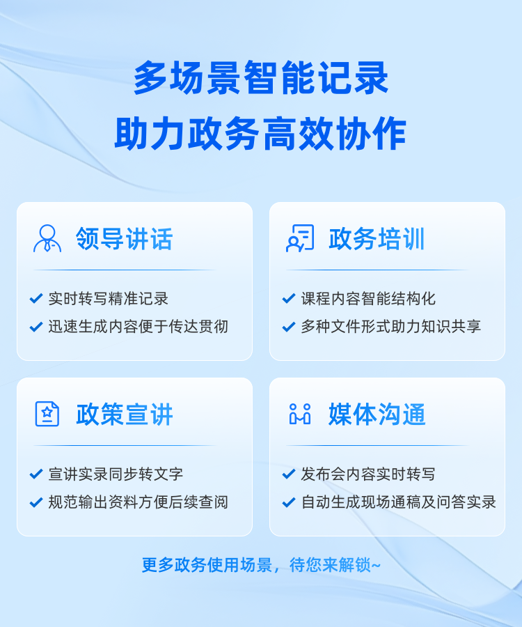 聆记致力于全面提升政务办公效能及成果转化价值,赋能多种政务场景,不止于会议。