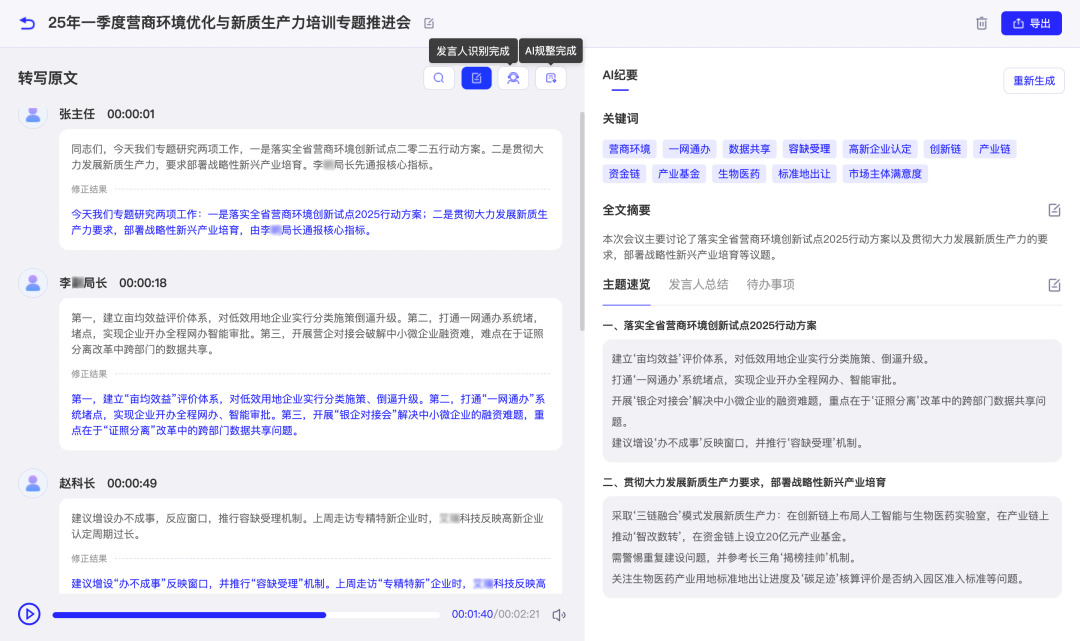 在政府部门的多人会议中,聆记凭借智能声纹识别技术可精准区分发言人并自动标记,清晰呈现对话脉络,还可依发言人生成对应概要总结;语音结束即可同步输出完整转写原文、重点突出的会议纪要、精准提炼的关键词、时间节点明确的待办清单,将会议讨论成果高效转化为可落地执行的工作计划,大幅提升政务办公效率。