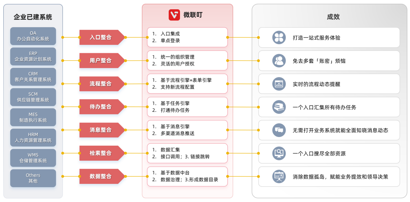 “微联叮”提供七大整合能力,帮助企业高效整合现有业务,打通企业信息化“经络”。